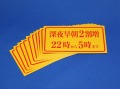 TOPタクシー用品 ステッカー 深夜早朝2割増ステッカーは車内に必ず貼らなければいけません。 表示通達には、『黄色地に赤色の文字で、深夜早朝における運賃の割増率及び適用時間を記載し、車両右側ドアーの三角窓又は相当する位置に、内部に向けて表示する』 と書いてあります。車内から見えるように貼るのが正解です。 10枚セットでの販売です。 【手数料込200円でお送りさせていただきます。代引き発送は除きます。】 深夜早朝2割増ステッカー10枚セット タクシー車両の表示通達適合品 価格: ¥3,500 (税込) 販売期間: 数量: セット 在庫 ○ 返品についての詳細はこちら